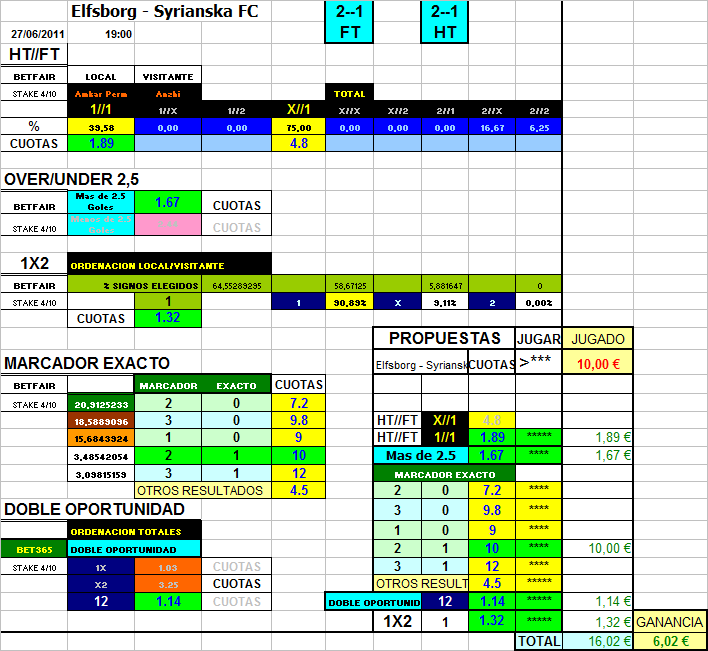 He añadido la tabla de HT/FT,ES DECIR,resultado al descanso y al final del encuentro,para ello los datos a manejar son el número de repeticiones de las 9 posibilidades que tiene este tipo de apuesta,tomando para ello las cuotas de betfair,y poniendo como mayor probabilidad de que se cumpla todos aquellos que superen al menos un 30% de resultados en cada una de las posibles soluciones,viendo que las cuotas son altas,podemos coger dos o tres resultados,la forma de hacerlo es tomando al equipo local y al equipo visitante cada uno en su papel y una vez realizada esta toma de datos,juntarlos para ver el % que puede conseguirse.