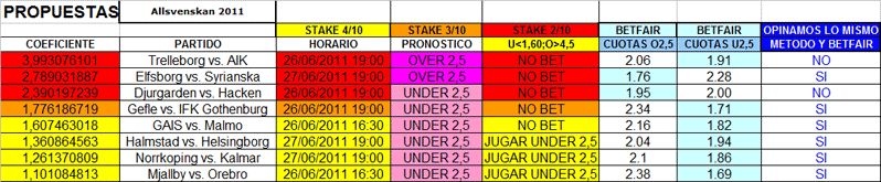 Primero nos encontramos con los marcadores exactos que van desde el cero a cero hasta el tres a tres,a su izquierda una columna que nos dice la probabilidad que tiene de que pueda salir ese resultado,en las tablas estan ordenados de mayor a menor probabilidad de aciertopor lo que marcamos en dicha tabla en color salmón los % mas altos,si vemos que alguno destaca lo pintamos en naranja,en color verde pinto los primeros cinco o seis resultados exactos,segun su cotizacion,por si alguien quiere jugar a resultado exacto,jugandolos todos los verder de la tabla,si se acierta no pierde dinero,ya que sus cuotas son bastante altas,y desde este punto,podemos ver a nuestra derecha si el partido,segun esos resultados puede terminar por encima o por debajo del over/under 2,5 goles,pintados en color rosa,viendo mas o menos la tendencia que puede tener el encuentro a estar por encima o por debajo de ese numero de goles.