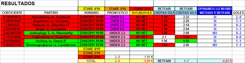Partidos de futbol al under/over 2,5 goles de las diversas ligas para MARTES , MIERCOLES Y JUEVES 21-22-23 de junio 2011.