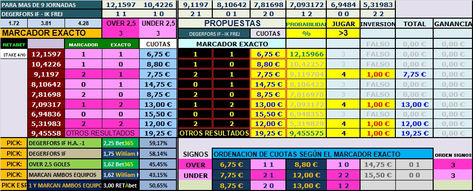 En cuanto a los goles que marcan y encajan, los del local tienen 20 marcados y 22 encajados, como vemos, hacen muchos, sobrepasan de media por encuentro el gol y les hacen por encima del número de partidos que llevan disputados, mientras que el visitante, ha marcado 17 y le han marcado 26, vemos que ellos, le hacen más goles que sus rivales y marcan menos goles, están también por encima del número de partidos disputados, así, si nos vamos al mercado over/under con la línea en el 2.5 goles ambos terminan muchos más partidos por encima de la línea que por debajo, así, los que hoy hacen de local tienen 9 por encima, estando en 5 de ellos por debajo del 2.5 goles, mientras que los visitantes,.ganan a sus rivales, 10 por encima, mientras que tienen 4 por debajo de la línea, eso sí, los que hoy hacen de locales jugando de local, de los 6 que han disputado en 4 de estos el partido terminó por encima de los 2.5 goles, los visitantes jugando a domicilio, de los 6 que han jugado en 5 de estos superaron la línea de los 2.5 goles, como vemos dos equipos muy overs cuando la línea la tenemos en los 2.5 goles y cada uno juega como lo hace hoy, el Degenfors de local y el Frej de visitante.