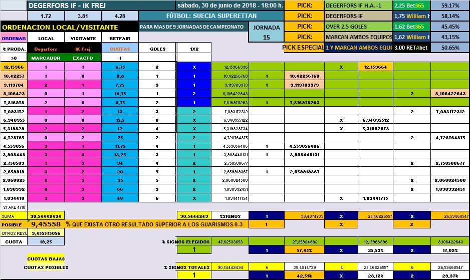 Partido de la Segunda división de Suecia, la Superettan, analizo el encuentro que disputan el Degerfors y el Frej, los que hoy juegan de locales, son séptimos del campeonato, después de 14 jornadas, llevan 5 victorias, 4 empates , 5 derrotas, como podemos ver, la situación los mete en la zona media de la clasificación, en los últimos cinco disputados con 2 victoria, 2 derrotas y 1 empate, los últimos tres encuentros fueron las derrotas y el empate, los visitantes, el Frej, está en la zona baja de la clasificación, 13ª posición, recordemos que esta liga son 16 equipos, ha conseguido 3 victorias, 4 partidos empatados, y ha perdido 7 partidos, sus últimos le han metido en una inercia algo positiva, ya que ha ganado dos y empatado los otros dos de los cinco últimos disputados.