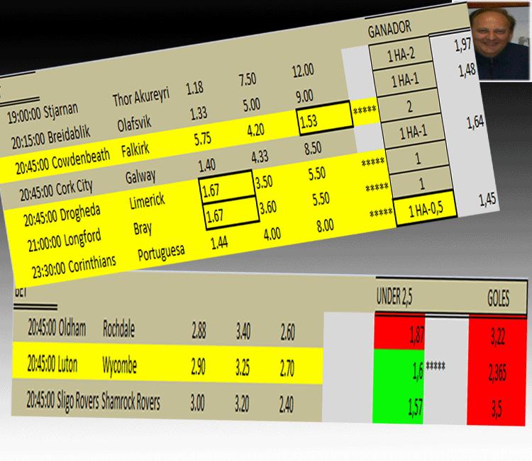 Trabajando en mis aplicaciones,una muestra de lo que tenemos hoy para el futbol,martes 24 de Marzo 2015,en la imagen los posibles ganadores en las filas de color amarillo,el signo es el rodeado por la cuadricula de color negro,es decir,la primera columna corresponde a la cuota del local,la segunda columna corresponde al empate y la tercera columna corresponde a la victoria visitante,4 partidos, a local nos salen tres,uno de ellos voy con el handicap y uno a visitante,en la segunda imagen me decanto por el under 2.5 del Luton - Wycombe,buena cuota,pero mirar el promedio de goles que sale por encima del 2,000 de coeficiente.El stake a aplicar en cada uno de los partidos es de 4/10.Vamos a ver las 5 estrellas si nos dan suerte.