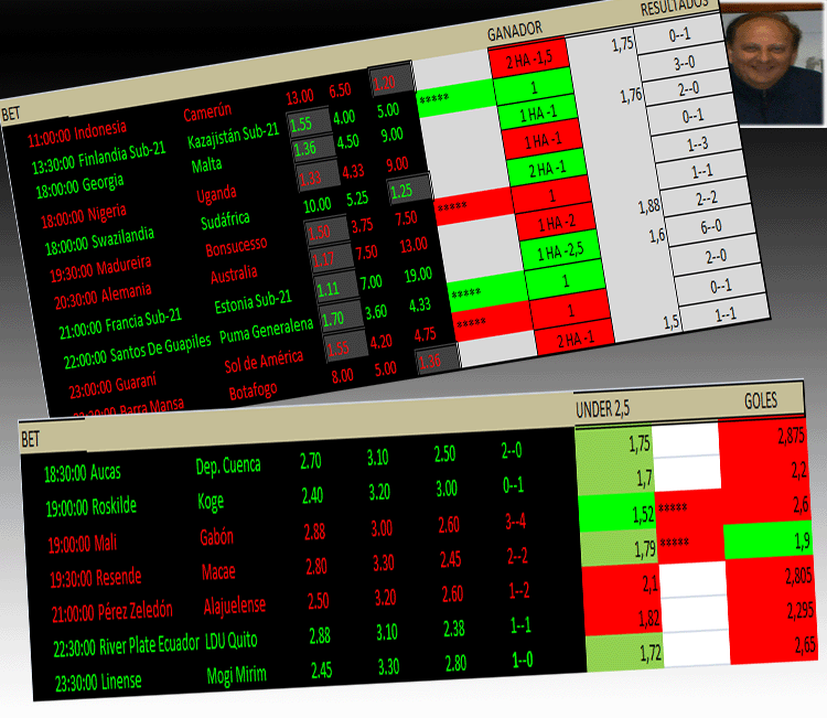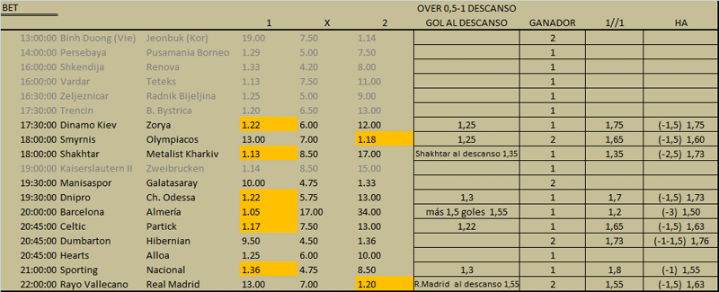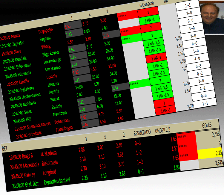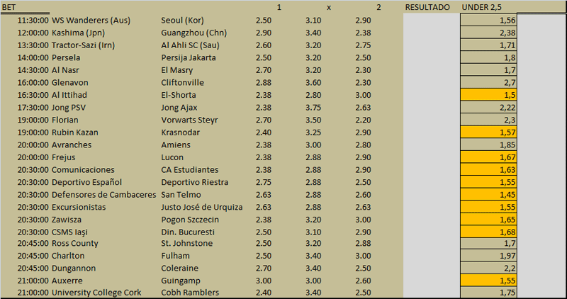 En cuanto a los del mercado over/under 2.5 goles,voy con el Galway - Longford que tanto en cuota al under 2.5 como en promedio de goles nos dan una primerísima probabilidad,aunque ya vemos que esto es bastante subjetivo en muchas ocasiones,luego tenemos el Braga B - U.Madeira, la cuota invita pero el promedio de goles roza el 2.5 por encima,para terminar esta trilogía en este mercado me quedo con el el partido internacional entre Macedonia - Bielorrusia,aquí la cuota tira mucho hacia que se produzca el under 2.5,pero el promedio de ambas selecciones llega al coeficiente 3,alto para este mercado.