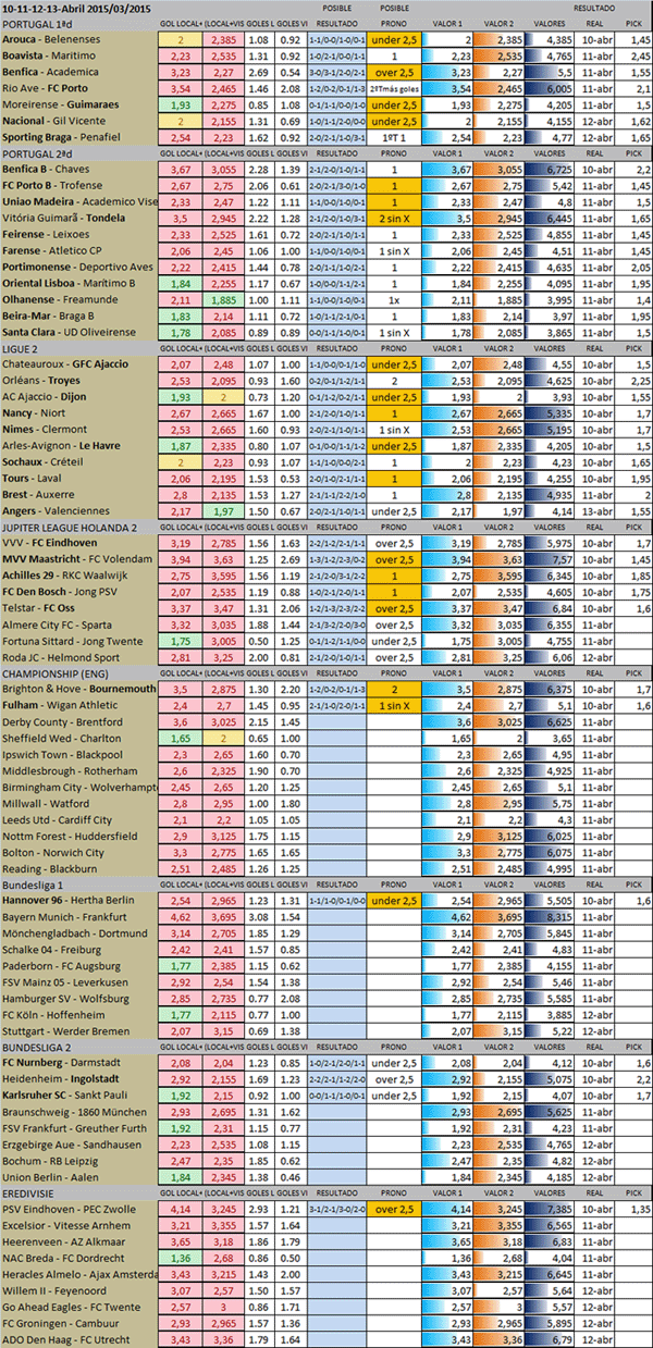 En cuanto a su funcionamiento,creo que es muy básico,ya que conociendo el teorema de Poisson para conseguir el número de goles de cada equipo,tanto en casa como fuera de casa,y como juegan,si a local,o a visitante consigues un resultado,a partir de ahí y analizando como ponen las cuotas las casa de apuestas,yo utilizo para ello,BETEXPLORER,que te sacan la lista de las cuotas de casi todas las casa de apuestas en todos los mercados posibles y tomando,yo pongo la más alta de todas,cotrastas tanto el resultado con las cuotas,y a partir de ahí,es la aplicación la que te saca el listado de los partidos con una buena tendencia al ganador,pero como ves,no deja de ser un método bastante estadístico,una vez sale el listado preliminar,le pongo filtros,como por ejemplo,nada de partidos amistosos,nada de partidos de Copa,nada de partidos de x ligas,etc.Así saco el primer listado válido,y dentro de este,ya dependemos de las con las cuotas o el intervalo que queramos trabajar,yo distingo varios tramos,el primer,que la cuota a jugar sea superior a 1.29 hasta algo más de 1.65,que son los que la aplicación en este primer filtro veis en los foros,luego hay otro filtro que nos coge el tramo que va desde 1.47 hasta el 1.30 que nos saca el handicap asíatico para subir cuota,esta normalmente está entre -0.5 y -1 al favorito,cuano las cuotas ya son menores de 1.30 hasta el 1.20 en tramo para el favorito puede ser entre el -1y el -1.5,las que son entre 1.19 y 1 tienen ya el baremos entre -2 y -3 para el HA (HANDICAP ASIÁTICO).