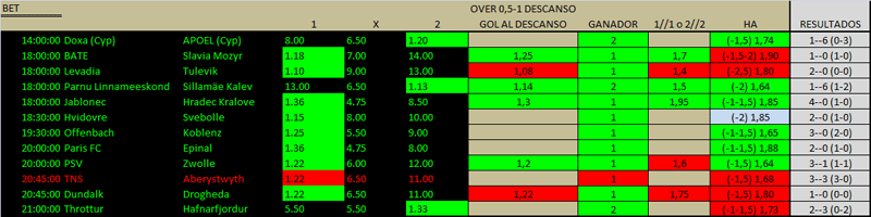 Curioso, yo estoy haciendo algo parecido (aunque muchísimo más rústico). Sin embargo he descartado el Villareal por la cuota (consigo sólo entre un 43-54% de certeza, lo cual no me cubre el 1,53 de la cuota).