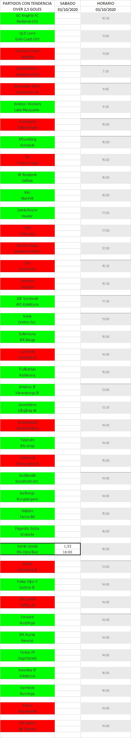 FUTBOL; MERCADO AL OVER 2.5 GOLES, PARA EL DOMINGO 4-10-2020.