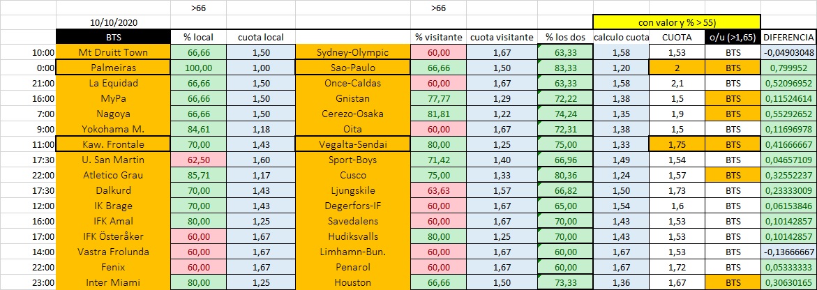 A groso modo, cálculo de la posible cuota para el equipo local y el equipo visitante, y la suma de ambas, para hallar la diferencia de cuotas, en verde las que tendrán valor, y en azul las que no, una de las premisas es que el % al over tanto de uno como del otro sea superior a 55, y la cuota que tenga valor para poder trabajar el pronóstico, podemos ser no más exigentes con la cuota, yo en este caso, os pongo una reseña que dicha cuota sea mayor de 1.65, aunque viendo los resultados, desde 1.50 o 1.45 los voy eligiendo.