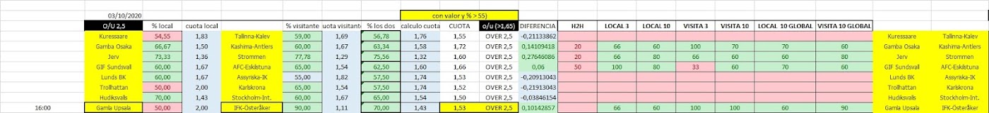 Aquí os muestro los partidos con tendencia al over 2.5 goles, sacando la cuota que puede tener valor, respecto a las que nos muestran las casas de apuestas, ya sabéis que las premisas son el stake 1/10 y no combinar partidos, como he tenido algo más de tiempo, he colocado mucho más datos, para que los entendáis, ya descarto los partidos que dejan de tener posible valor, los que lo tienen y tienen un alto cumplimiento, al final os pinto la cuota y el over 2.5 de amarillo, teóricamente serán los que más posibilidades tengan de salir, pero ya sabemos que puede ocurrir cualquier cosa.
