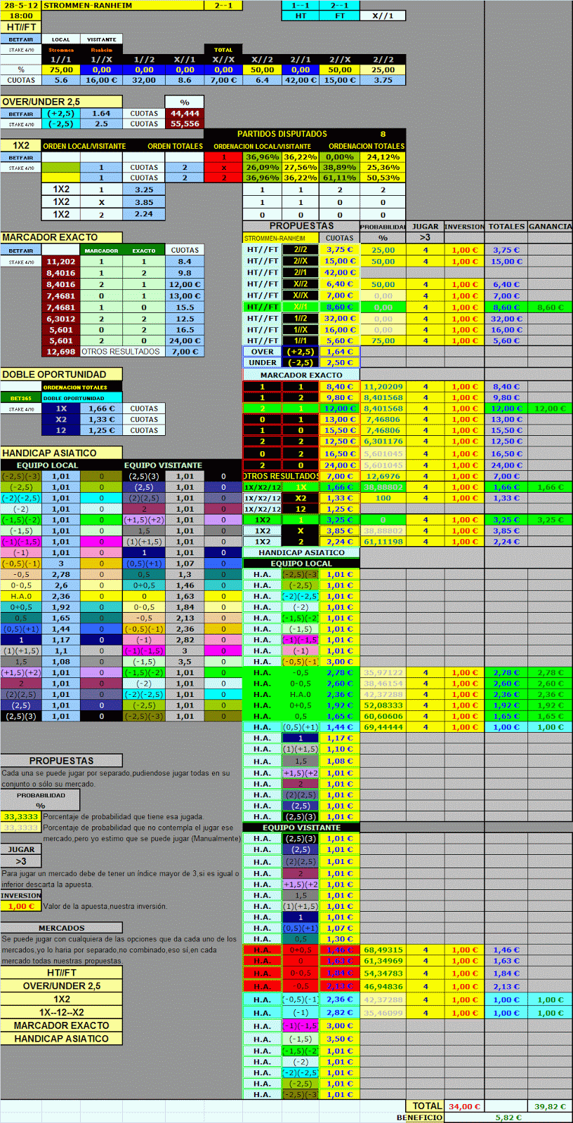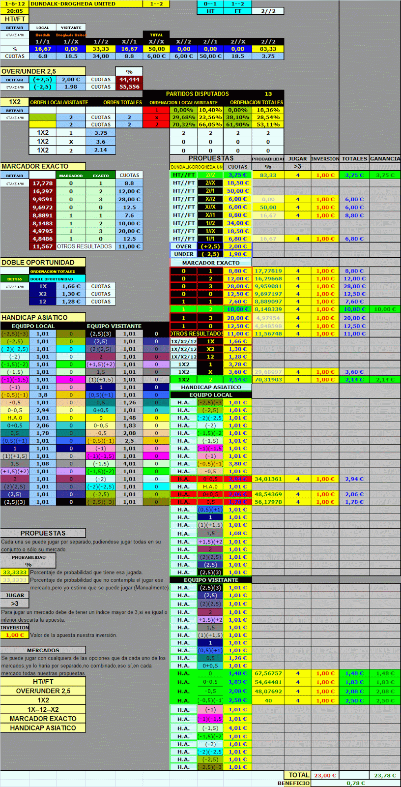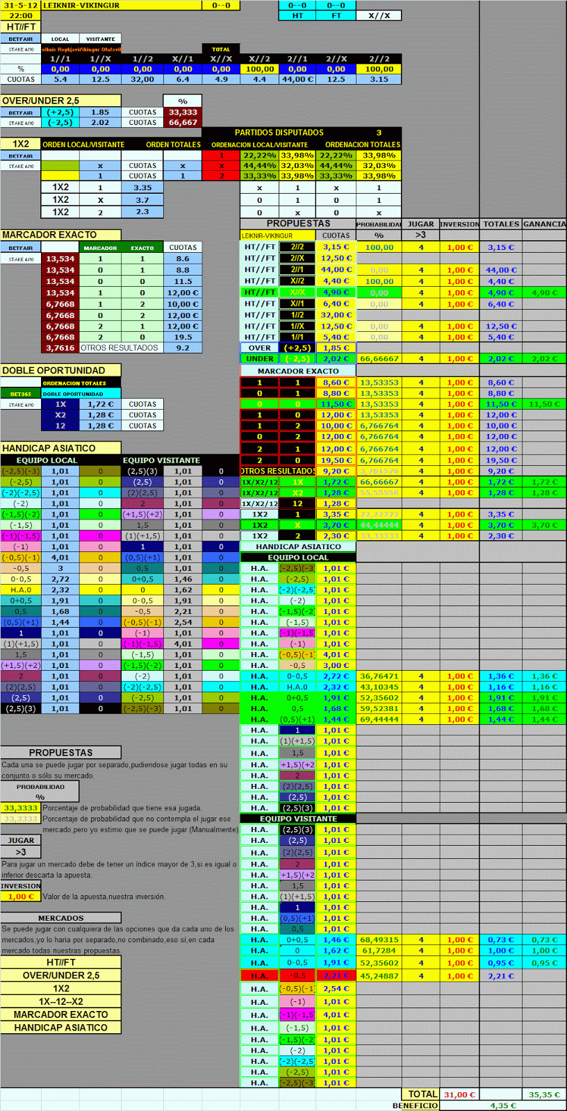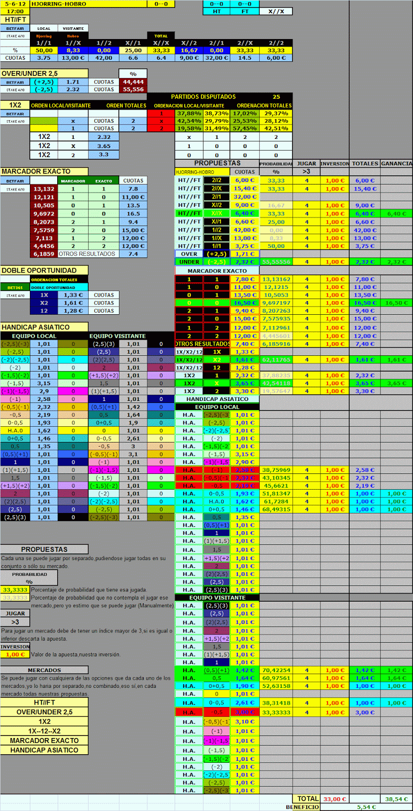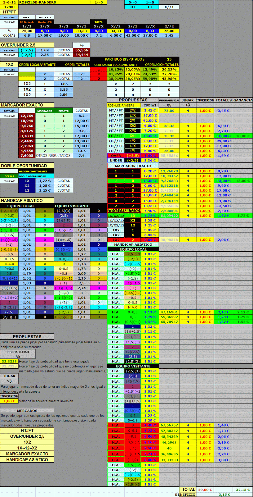 He añadido la tabla de HT/FT,es decir,resultado al descanso y al final del encuentro,para ello los datos a manejar son el número de repeticiones de las 9 posibilidades que tiene este tipo de apuesta,tomando para ello las cuotas de betfair,y poniendo como mayor probabilidad de que se cumpla todos aquellos que superen al menos un 30% de resultados en cada una de las posibles soluciones,viendo que las cuotas son altas,podemos coger dos o tres resultados,la forma de hacerlo es tomando al equipo local y al equipo visitante cada uno en su papel y una vez realizada esta toma de datos,juntarlos para ver el % que puede conseguirse.