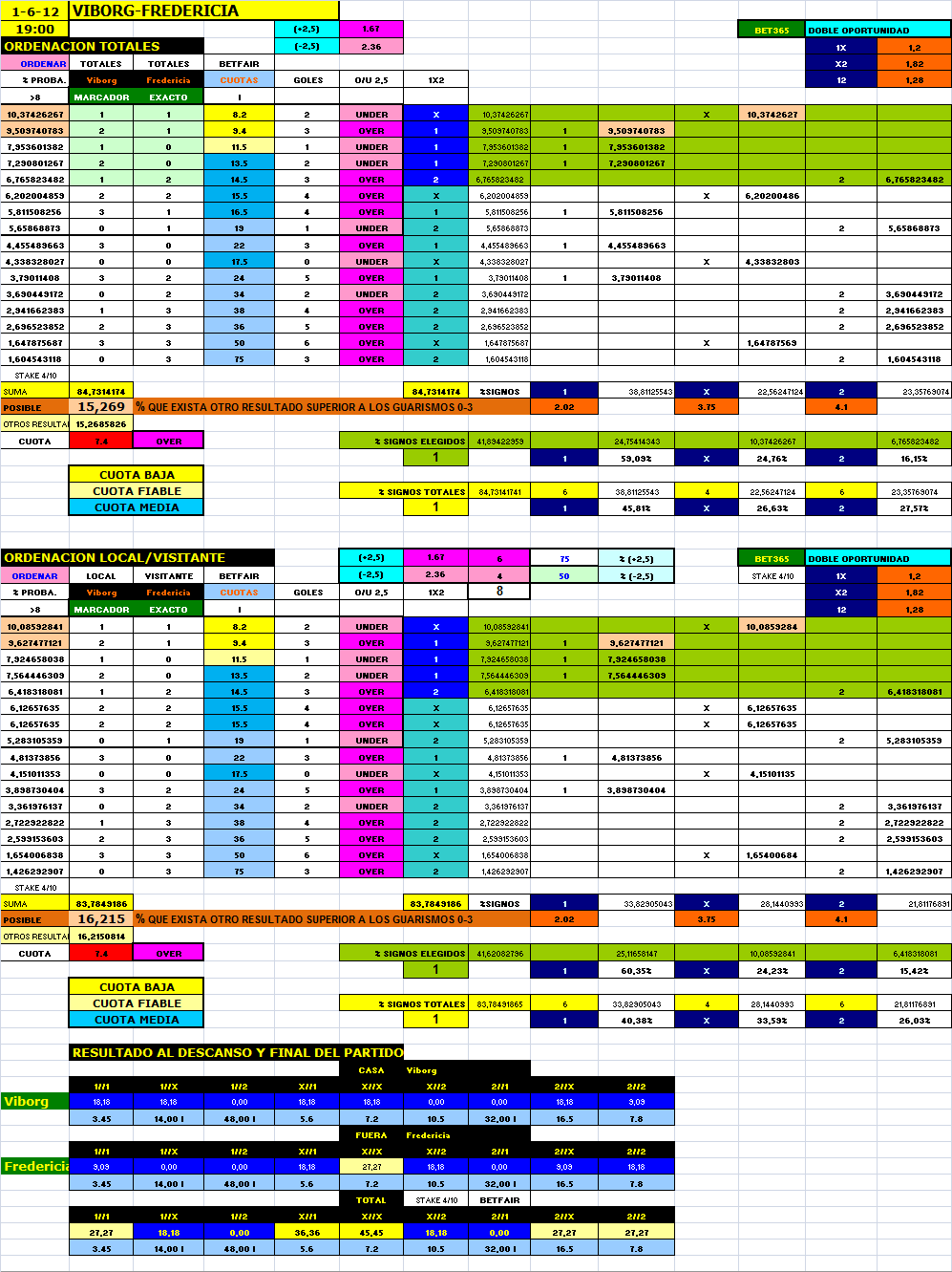 Primero nos encontramos con los marcadores exactos que van desde el cero a cero hasta el tres a tres,a su izquierda una columna que nos dice la probabilidad que tiene de que pueda salir ese resultado,en las tablas estan ordenados de mayor a menor probabilidad de aciertopor lo que marcamos en dicha tabla en color salmón los % mas altos,si vemos que alguno destaca lo pintamos en naranja,en color verde pinto los primeros cinco o seis resultados exactos,segun su cotizacion,por si alguien quiere jugar a resultado exacto,jugandolos todos los verder de la tabla,si se acierta no pierde dinero,ya que sus cuotas son bastante altas,y desde este punto,podemos ver a nuestra derecha si el partido,segun esos resultados puede terminar por encima o por debajo del over/under 2,5 goles,pintados en color rosa,viendo mas o menos la tendencia que puede tener el encuentro a estar por encima o por debajo de ese numero de goles.