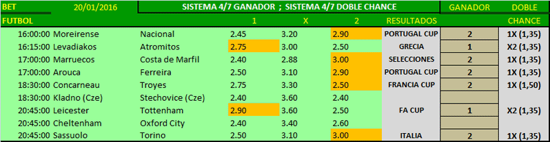 SISTEMA 4/7, para hoy VIERNES 22 Enero 2016.Podemos jugarlos también por separados, a simples.