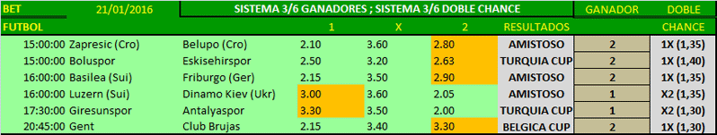 Pick´s futbol del dia 22 de Enero del 2016.Pick´s futbol; Una de las aplicaciones muestra las siguientes propuestas; VIERNES 22 Enero 2016, Ganador del partido en primer filtro, celdas de color naranja, y sus especiales, baja la cuota pero posibilita más su acierto, stake 2/10.