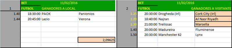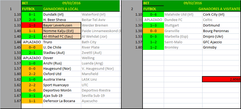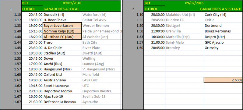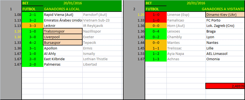 Futbol, partiendo de las cotizaciones diarias de las casas de apuestas ordeno las cuotas de más favoritas a menos favoritas,hasta el 1.70, y los he separado diferenciando si es a local o a visitante, dentro de nuestros parámetros hoy presentamos varios partidos, se encuentran entre el 1.20 y el 1.30, esta es la imagen para hoy 22 de Enero del 2016.