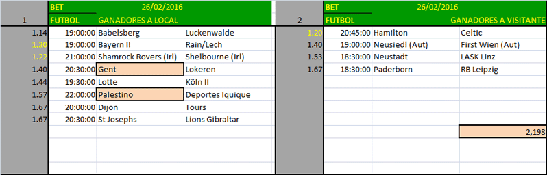 Futbol, partiendo de las cotizaciones diarias de las casas de apuestas ordeno las cuotas de más favoritas a menos favoritas,hasta el 1.70, y los he separado diferenciando si es a local o a visitante, dentro de nuestros parámetros hoy presentamos partidos, se encuentran entre el 1.20 y el 1.30, esta es la imagen para hoy 16 de Febrero del 2016.