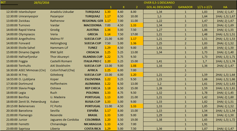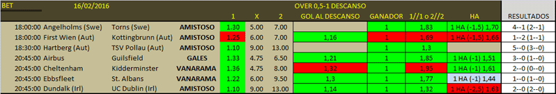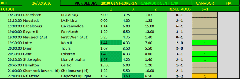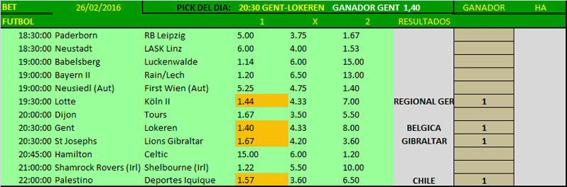 Pick´s futbol; Análisis de la aplicación, para hoy martes 16 Febrero 2016, stake 2/10, mercados gol al descanso, ganador, HT//FT y HA, estos son los que elige la aplicación, podeis hacer vuestra eleccion.