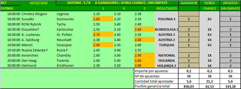 Podemos jugarlos también por separados, a simples. pero cuidado con el stake, muy bajito, 0.5/10.Voy a proponer siempre que tenga parámetros para ello, y el excel nos los de, un sistema de partidos, con cuotas altas, y por defecto otro que agrupe los dos signos que nos falten de cada partido, a doble chance y quitando el empate.