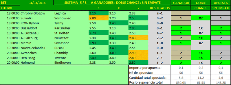 Hasta el momento el que mejor está funcionando por el número de aciertos casi siempre dentro del sistema es el de doble chance, pero no se llega a recuperar lo jugado a no ser que se acierte el total o haya un sólo fallo, por lo cual, debemos de jugar uno de los tres sistemas propuestas, pero con un stake muy bajito, 0.5/10.