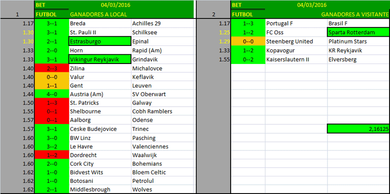Futbol, partiendo de las cotizaciones diarias de las casas de apuestas ordeno las cuotas de más favoritas a menos favoritas,hasta el 1.70, y los he separado diferenciando si es a local o a visitante, dentro de nuestros parámetros hoy presentamos partidos, se encuentran entre el 1.20 y el 1.30, esta es la imagen para hoy 3 de Marzo del 2016.