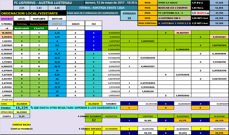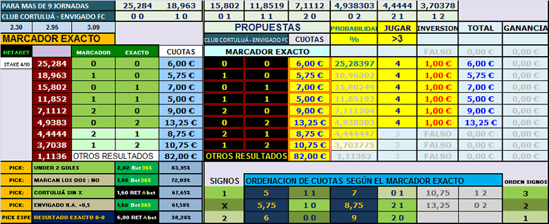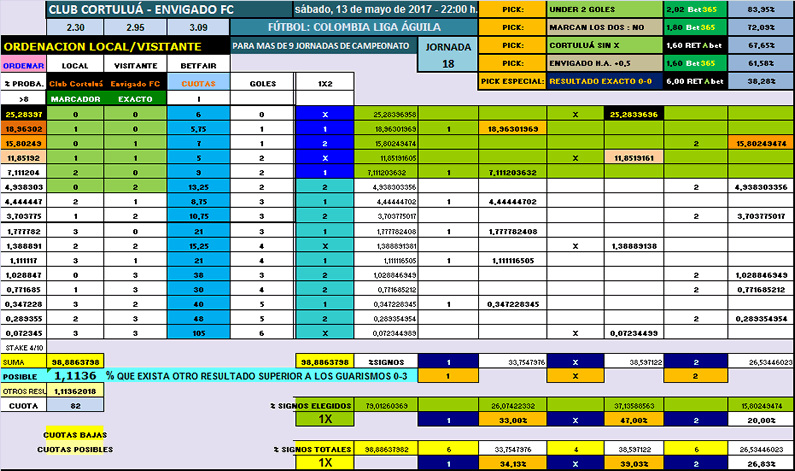 Visto el entorno, nos metemos con lo que el excel nos analiza y nos deja, en este caso, los resultados ordenados por probabilidades al marcador exacto, nos muestran con un 16% el 1-0, para con el 12% darnos los empates a uno y a cero, con un 10% el 2-0, 9% el 0-1 y a partir de aquí, el 2-1, 3-0 y 1-2, el primer pronóstico que nos deja es el mercado over/under, y concretamente por debajo de la linea del 2.5 goles,nos da casi un 62% de posibilidades que se pueda producir, y aquí, no sapoyamos con el 1-0, 1-1, 0-0, 2-0, 0-1, es decir, los cinco primeros resultados que salen calculados al marcador exacto. de estos cinco, hay cuatro que no marcan los dos, que con un 54% nos da la aplicación como segundo mejor pronóstico, bueno, en esto no me extiendo mucho, al grano, vamos a explicar, que lo que nos muestra el excel, son los datos en el tiempo, es decir, según lo avanzado de la temporada, tenemos más cosas analizadas, bien, ordenando las cuotas, de los resultados al marcador exacto, tenemos un resultado, que si ya de por sí, con lo que tenemos analizado nos dice que es muy probable que suceda, por la trayectoria de ambos equipos, hoy en las cotizaciones, ronda la cuota 4, lo que hace pensar, que es un resultado que se pueda producir a dia de hoy, por el momento de los equipos para este partido, si además, vemos que en los seis primeros resultados según ordenamos por las cotizaciones de hoy, aparecen, como siempre los dos empates, a uno y a cero, que los ponen las casas de apuestas por castigo, con cotizaciones entre 5 y 7 de cuota, hoy y en este partido tenemos dos resultados en favor de los locales, 1-0 y 2-0, por delante de estos, y si el primero comentaba que su cuota casi es 4, el segundo es cuota 5, lo que nos indica, y si os poneis a mirar partidos y cotizaciones de hoy, a ver cuantos encontramos que estos dos resultados exactos tengan esa cotización por delante de los empates y que después, sigan otros dos resultados en favor de los locales, ya a cuotas 8 y 9, 2 1 y 3-0, estos ya salen por encima de la linea del 2.5 goles, por todo esto, yo me voy a decantar, por la victoria de los locales, y que no se marquen más de 2 goles, vamos que voy con eso 1-0 o ese 2-0, a ver si lo conseguimos, hoy la cuota no es tan grande, pero combinando los mercados a ganador del partido y número de goles, esta en el 2.65.