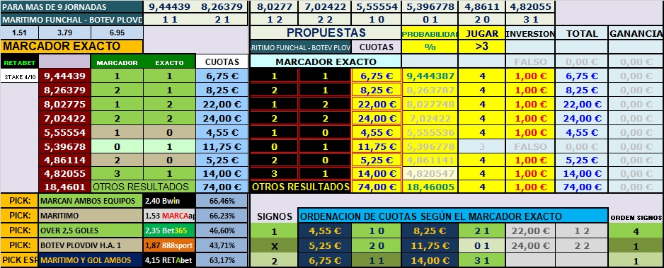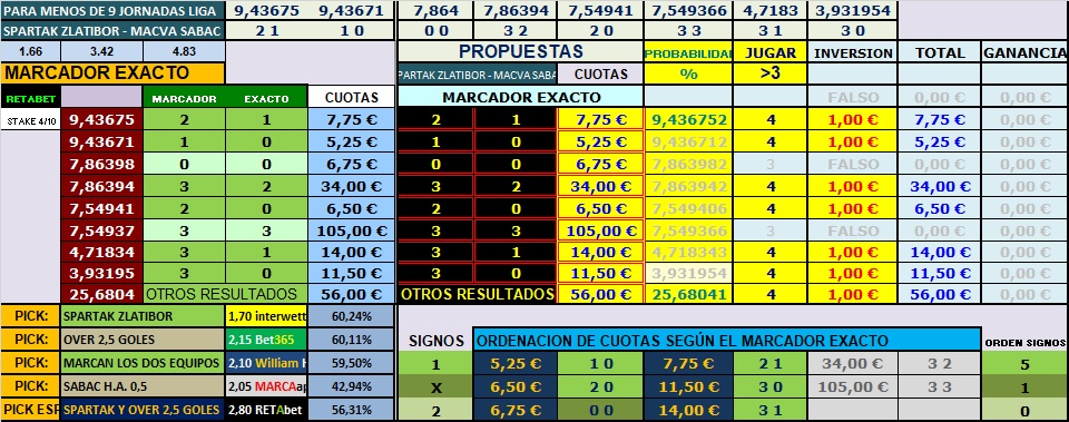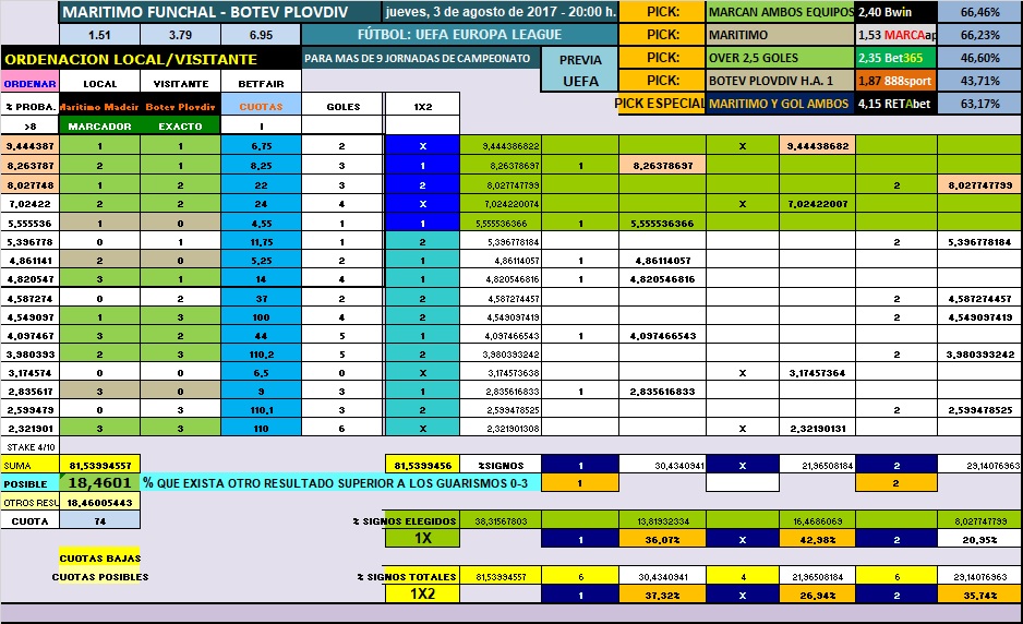 La probabilidad real, para este encuentro, nos deja muy cercanas estas con las que ajustan las casa de apuestas, lo que hace por ejemplo, que la victoria del equipo local, se esté pagando alrededor del 1.90-2.00 y nos sale un valor entre 2.00 y 2.20, lo que nos dice, que más menos están alineados , dejando diferencias grande en la victoria de los visitantes, 3.3 -4.2 en el método de últimos en casa los locales y últimos los visitantes fuera, y ajustando y mucho en los últimos disputados por ambos equipos, entre 4 de la real y el 4.20 que marcan las bookies, por lo que estas cuotas son muy parecidas.