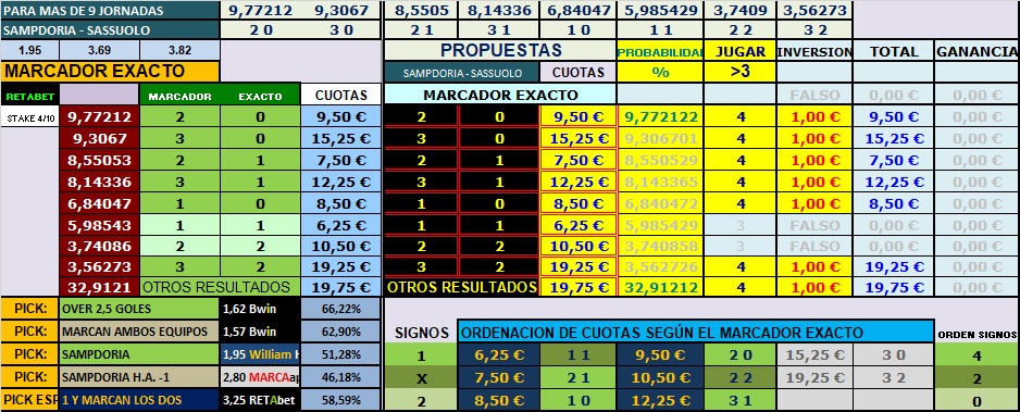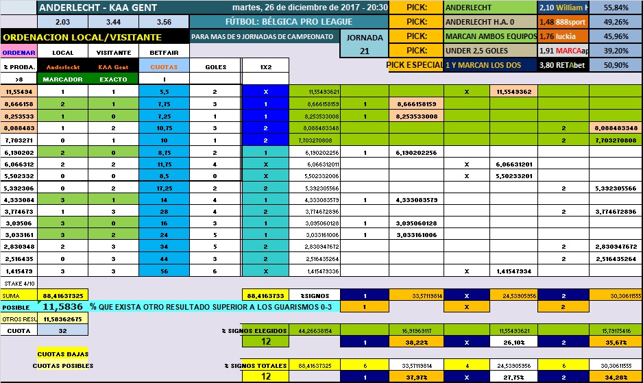 El excel como primer pronóstico, nos deja el mercado al ganador del partido, el equipo local pese a sus regulares números, lo tenemos por encima de sus rival en la clasificación, y con la falta de goles anotados cuando salen fuera de su estadio, sin contar el último, con la borrachera de goles en Colonia, que por cierto ganaron 3-4, estos no acumulan buenos números de visitante, pese a que en este último tramo de cinco encuentros han mejorado, los mejores resultados que nos muestra la aplicación para ir con el pronóstico, con un 58% de fiabilidad, le otorga los resultados al marcador exacto, estos resultados como digo son 1-0, 1-1, 2-0, 0-0, 2-1, 0-1, 3-0 y 1-2, las opciones que nos muestra la aplicación en favor de la victoria de los locales, y dando el primer resultado con un 14% y el segundo para ellos con un 10% de fiabilidad, cuatro resultados de los ocho mejores opciones para ellos, y 3 de estos entre las 5 primeras opciones, más los dos empates, el empate a uno y a cero goles, y podemos contemplar las victorias de los visitantes en los 0-1 y 1-2.