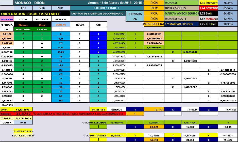 La probabilidad real también nos da un equilibrio, como ya sabéis, utilizo un par de métodos para averiguar la cuota que doy como punto de partida a los tres signos que podemos utilizar a la victoria del equipo local, al empate entre ambos conjuntos, y a la victoria del equipo visitante, también, y cuando proceda, estos mismos métodos, los utilizo para sacar la cuota del mercado over/under y el que si algún equipo se queda a cero goles o marcan ambos equipos, uno de ellos es tomando a cada equipo como actúa en el encuentro, es decir, si lo hace de local, sólo cogemos los partidos que ha jugado a local, y el equipo que hace de visitante, pues tomamos todos los encuentros que ha disputado de visitante, y el otro método, es el que da igual como juegue, cogemos sus últimos disputados, y los comparamos con los que nos dejan las casas de apuestas, en este caso, podemos observar lo que nos sale con ambos métodos respecto a lo que marcan las bookies, en este caso, contando con el pronóstico que voy a seguir, nos deja la probabilidad a la victoria de los locales en ambos procesos como opción más clara, por el primero de los dos métodos, las cuotas son, local, 1.43, empate 6.67 y victoria visitante 6.67, estas para el primero, y para el segundo, la victoria local a 1.54, el empate a 6.67 y la victoria del visitante a 5.00, las bookies ponen las cuotas en 1.85 para el local, 3.50 el empate y la del visitante en 4.33 , como vemos en ambos métodos nos sale la victoria del local, incluso con mucho valor, entre un 29% y un 20%, dependiendo de cada uno de los métodos para calcular la cuota, como más cercanas a estas, lo que hace que me incline por ellos.