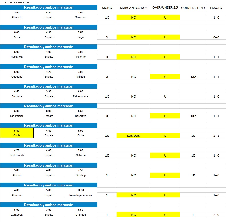 El Asiático,nos dejan según las bookies 2 resultados en favor de ese handicap 0 para el Granada, uno que anulara la selección, y 3 que irá en favor de la Unión Deportiva , según tomando las cotizaciones que nos dejan el marcador exacto, El excel nos deja también dos de las 8 primeras opciones al marcador exacto en favor de este mercado, 1-2 y 0-1, para dejarnos nulas, los empates a uno y a dos, y dando el hándicap en favor de los locales en cuatro posibilidades, 2-1, 1-0, 2-0, 3-1. cómo vemos dentro de estos cuatro dos de ellas son al unísono qué marcan los dos equipos, hay over por encima de los 2,5 goles