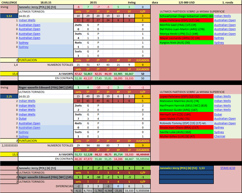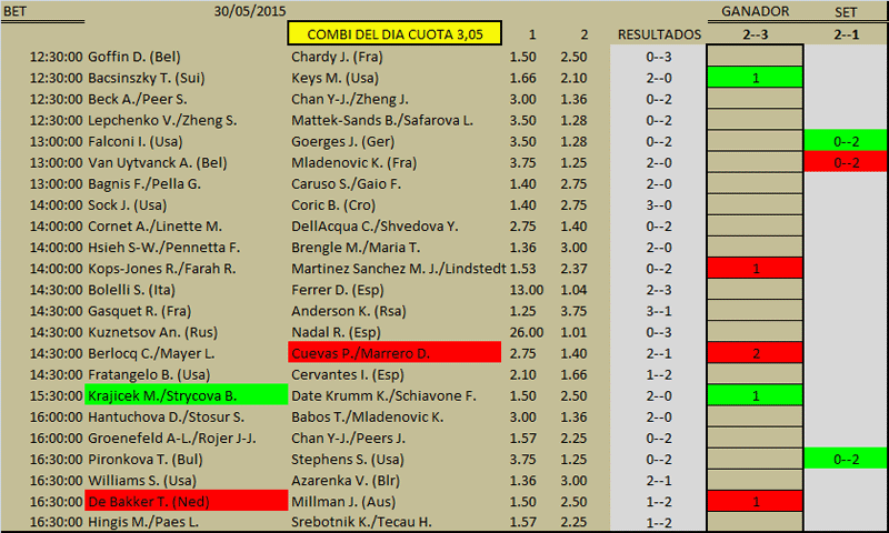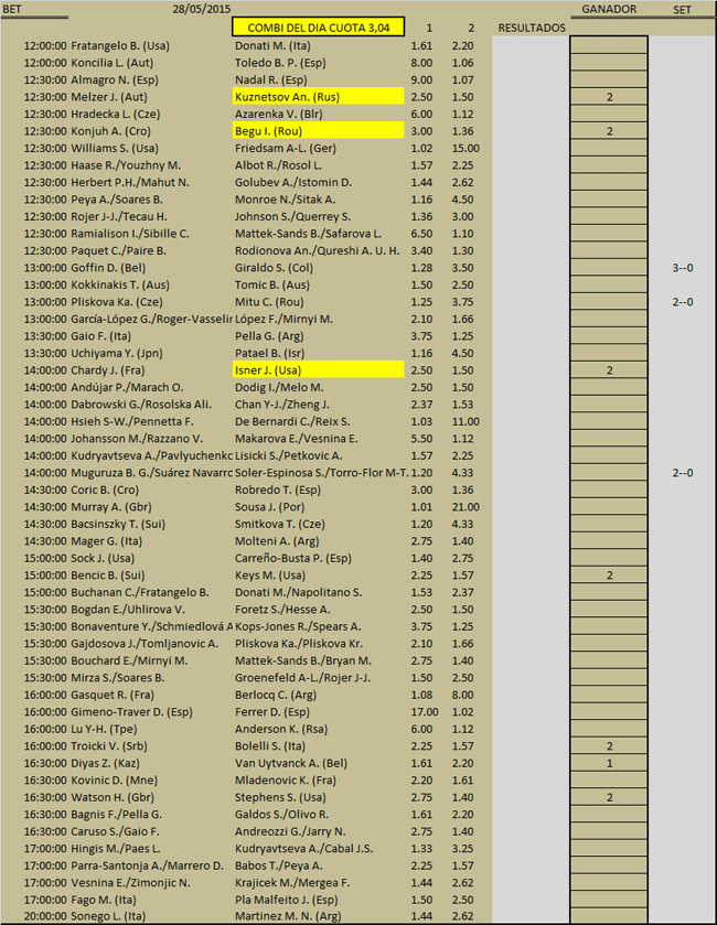 Incluyo combinada de 3 encuentros con cuota de 3.05,los tenistas elegidos son los de las celdas amarillas,stake 1/10.