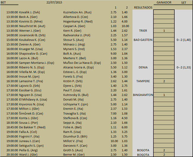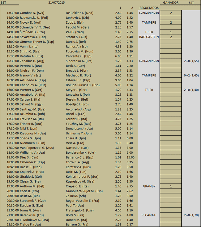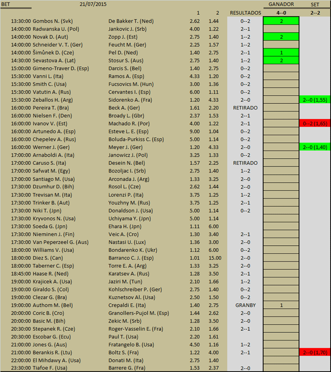 16/07/2015 3 1 2 117/07/2015 3 1 3 0Las fechas que aparecen en verde,he doblado y en un par en triplicado unidades,que sólo hay dos dias si no me he confundido,que no he cogido unidades,muchos de esos dias ha sido cogiendo la combi que tomamos de los pick´s a resultado exacto,como favoritos,ya que hay casos que aún perdiendo el pick´s a sets,como ha ganado el partido el favorito se ha acertado,otros dias cogiendo un par o tres como mucho de los pick´s a ganador.y utilizando stake 1/10,partiendo de esas 20 unidades,hoy por hoy estoy en un bank de 49 unidades,pienso que para el medio mes que llevamos no está nada mal,pero no hay que buscar y buscar pick´s por aquí o por allá,por muy chollos que nos parezcan.