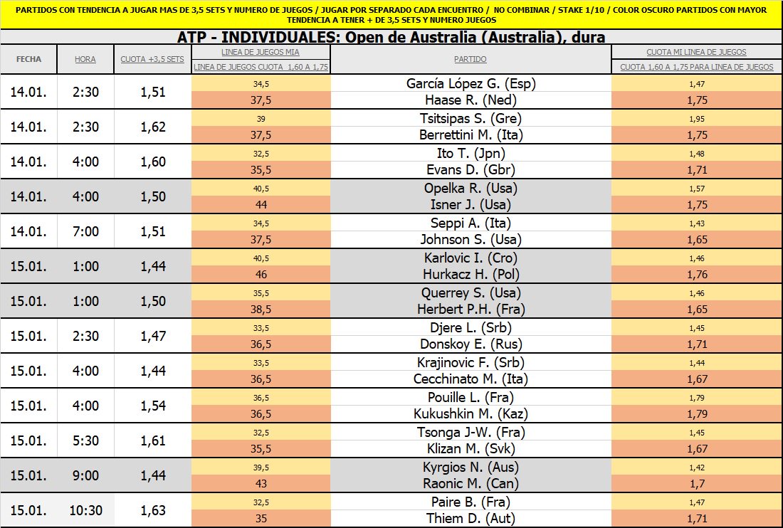 Con estos datos y diciendo que además no puede ganar al menos un set en un 66% de las veces como primer pronóstico, seguido de que habrá más de 22,5 juegos en el encuentro, y qué el norteamericano, según la valoración otorgada, sería el ganador del partido, personalmente buscaré que sea un partido por encima de los 22,5 juegos, no necesariamente se tienen que llegar a los tres sets, ya que un partido donde haya tie-break en uno de los dos primeros sets, completándolo con el que falta a un tanteo de 10 juegos se cumple.