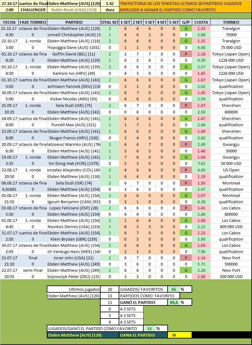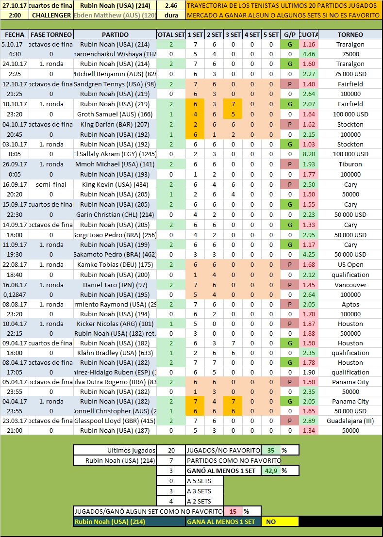 Podemos ver que Rubin cuando las casas de apuestas lo dan como no favorito del partido que va a jugar, no supera el 43% de efectividad, ya que de los últimos 20 jugados en 7 de estos salió como no favorito, y de estos ganó al menos un set o el partido en 3 de ellos, mientras que a Ebden, cuando sale de favorito, de los últimos disputados nos deja una efectividad del 85%, ya que de los 20 últimos, en 13 de eslos salia como favorito, y en 11 consiguió la victoria.