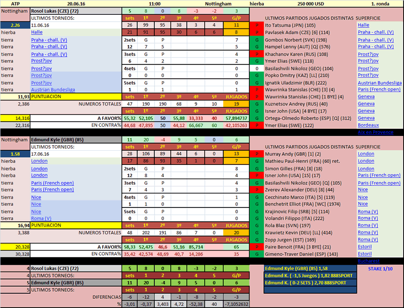 ATP Nottingham, 1ª ronda, juegan Rosol Lukas (CZE) (72) con Edmund Kyle (GBR) (85) , sobre la hierba, dos tenistas que apenas pisan la superficie, el checo, jugó esta semana pasada en el torneo de Halle la primera ronda de las Qualification, eliminado por Ito Tatsuma (JPN) (105) en dos sets, 7-6/6-3, el año pasado dos partidos en Wimbledon, ganando en primera ronda a Gulbis Ernests (LVA) (83) y perdiendo en segunda ronda con Andujar-Alba Pablo (ESP) (37), priemra ronda en Halle y en Alemania, en el 2014 y en el 2013 otros tres partidos por año, sólo en el 2012 llegó a pisar unos cuartos sobre la hierba de Eastbourne.
