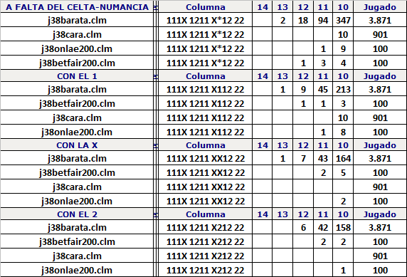 Los vigueses siguen sin perder desde hace ya diez jornadas,cuatro empates y seis victorias,en casa solo cuentan con la derrota de la primera jornada con el Barcelona B,luego nadie a podido ganar en Balaidos,su ultimo en casa es un empate con el Xerez,tercera posicion a dos puntos del Rayo y del Betis,enfrente un Numancia que viene de ser goleado en casa por el Rayo,que fuera de casa despues de ganar dos consecutivos en Valladolid y en Ponferrada viene de perder en Girona,los sorianos estan a cuatro puntos de la promocion,y querran sacar algo positivo de un campo que es muy complicado,por sobre todo,la muy buena linea que llevan los celestes. 1x (1)