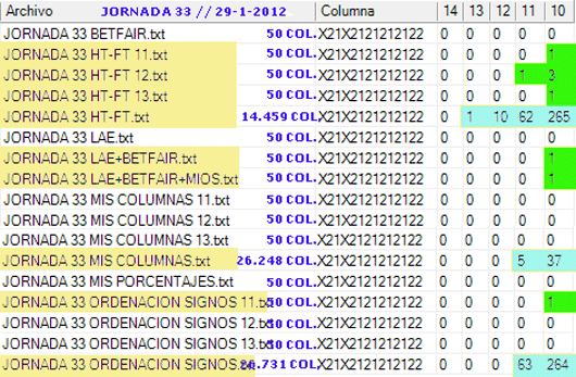 Aquí tenemos las diferentes propuestas para esta jornada 33 de quinielas,jugarla al directo aplicando estas condiciones son 26.248 columnas,esta semana el pleno al 15 lo pongo a X.
