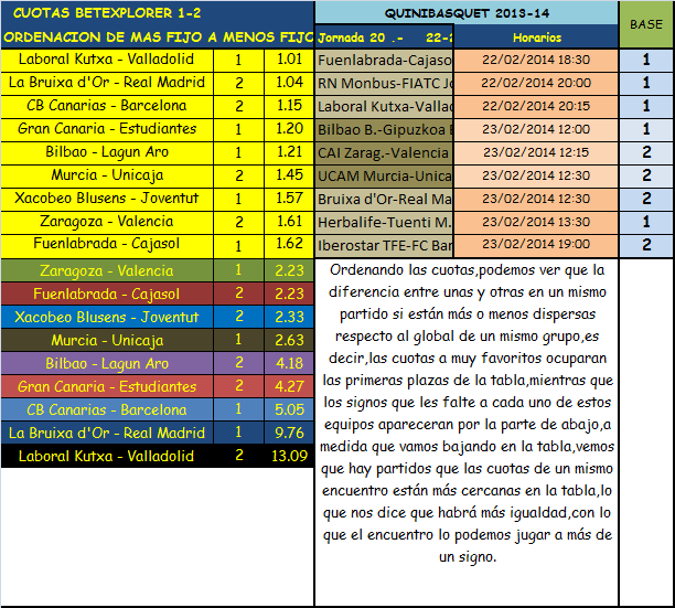 Información QUINBASQUET jornada 20,sábado y domingo 22 y 23 Febrero 2014.