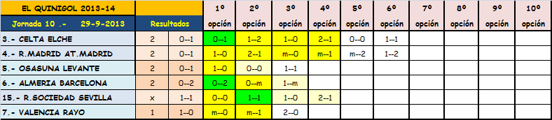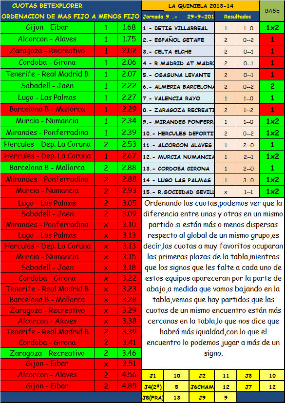 Las cuotas ordenadas de más favoritas a menos ,hace por lo menos en la primera división llenarnos el boleto de casi fijos,como podeís ver en la imagen Español,Celta,R.Madrid,Osasuna,Barcelona y Valencia,tienen a las casa de apuestas con criterio de ganadores,dejando a los dos que no entran en la quiniela y el Betis con el Villarreal como los partidos de tendencia muy abierta hacia cualquier signo.