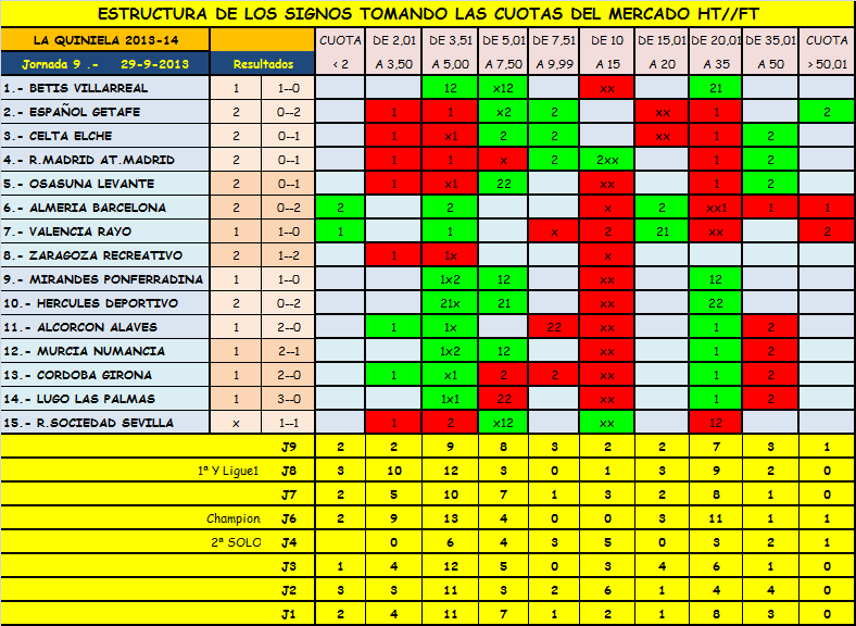 En el mercado HT//FT,volvemos a tener cuatro encuentros claros hacia las victorias de Español,R.Madrid,Barcleona y Valencia,complicándose los signo de una tendencia clara como pueden ser la victoria del Zaragoza,la del Alcorcón o Cordoba,forzando a cubrir con algún otro signo por lo que nos muestran los tramos.