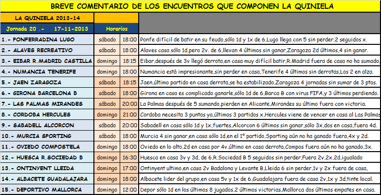 Información quiniela jornada 20 y quinigol jornada 22,sabado y domingo 16 y 17 Noviembre 2013.