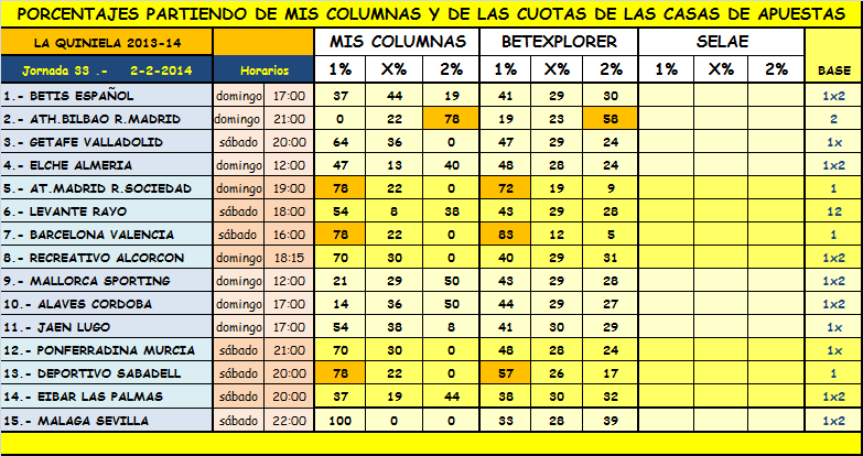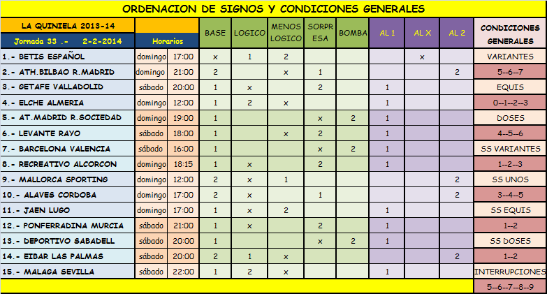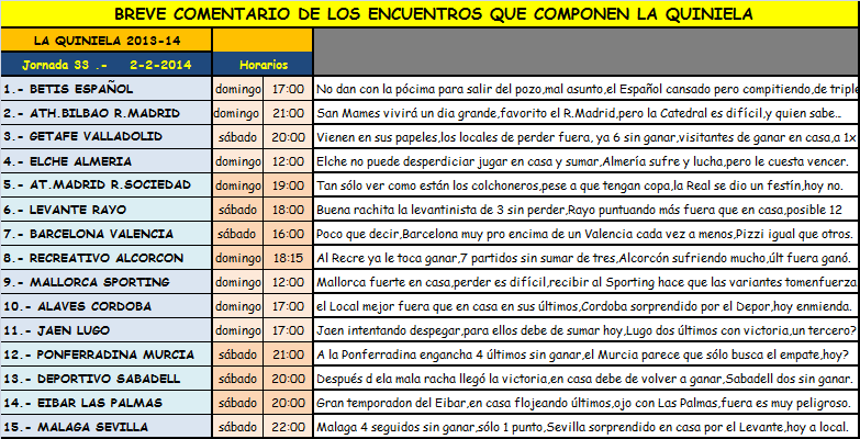Información QUINIELA jornada 33 y QUINIGOL jornada 36,sábado y domingo 1 y 2 Febrero 2014.