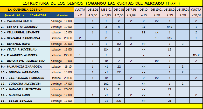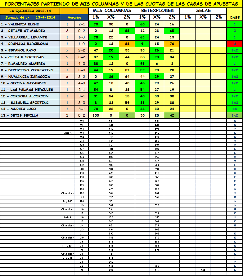 Información QUINIELA jornada 46 y QUINIGOL jornada 51,sábado y domingo 12 y 13 Abril 2014.
