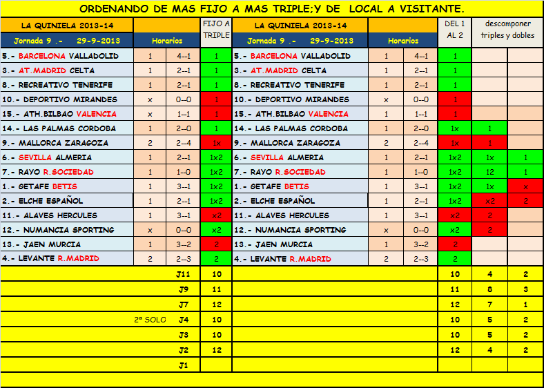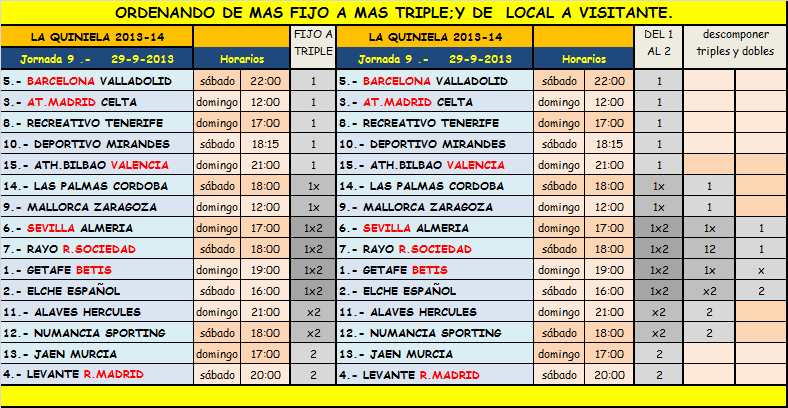 Los casi fijísimos de todas las jornadas,Barcelona,R.Madrid y AT.Madrid,pese a jugar sus compromisos europeos entre semana son claros,sus rivales parece que se tendrán que conformar con verlos pasar,ya que Valladolid,Levante y Celta son equipos de otra liga comparándolos con estos tres colosos.Si añadimos el favoritismo que se muestra en segunda con el lider de segunda,el Recre que recibe al Tenerife,unido a el Depor que juega en casa frente a un equipo incómodo,pero aún así le dan muchas probabilidades de victoria,junto la visita de un buen Murcia a Jaen y un Sporting que irá a Soria,casi podemos decir que la mitad de esta quiniela tiene,cogíendo algunos de estos con dobles,medio boleto solventado,si esto fuera así de fácil,todos seríamos premiados,y como siempre nos quedaremos con las ganas,pero bueno,sirva esta reflexión como preámbulo a nuestros contenidos.