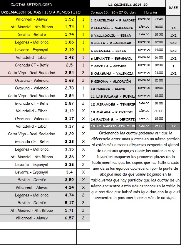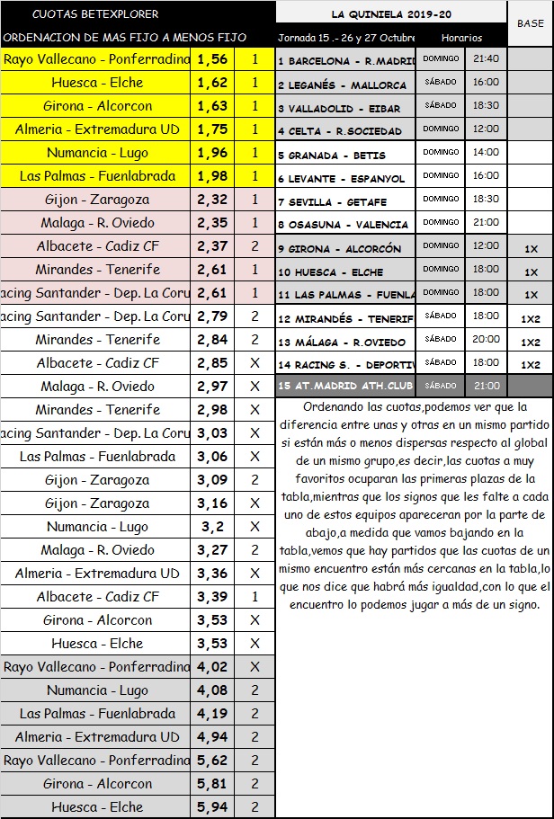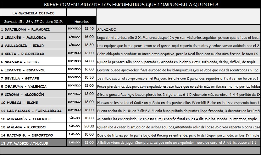 QUINIELA 15 TEMPORADA 19-20; SABADO Y DOMINGO 26 Y 27 OCTUBRE 2019.