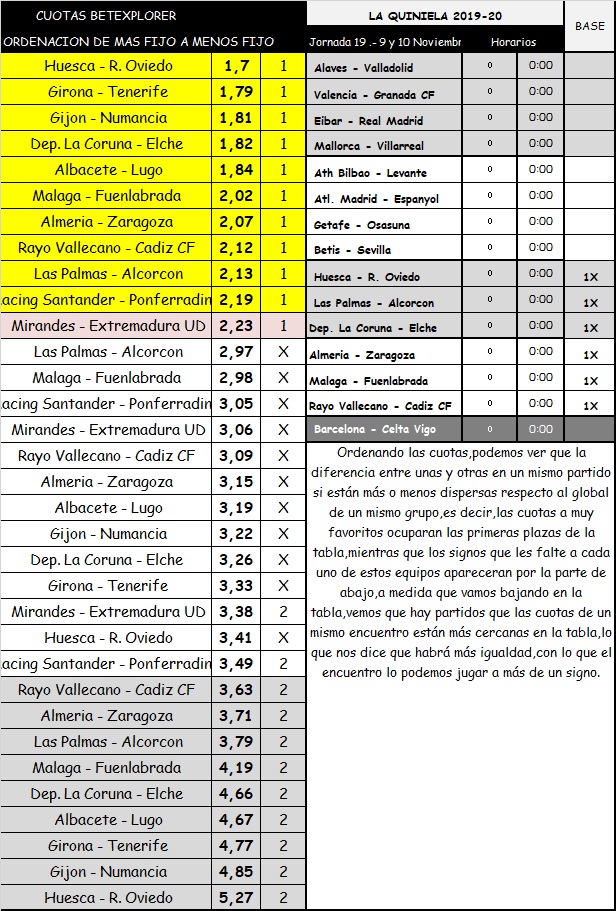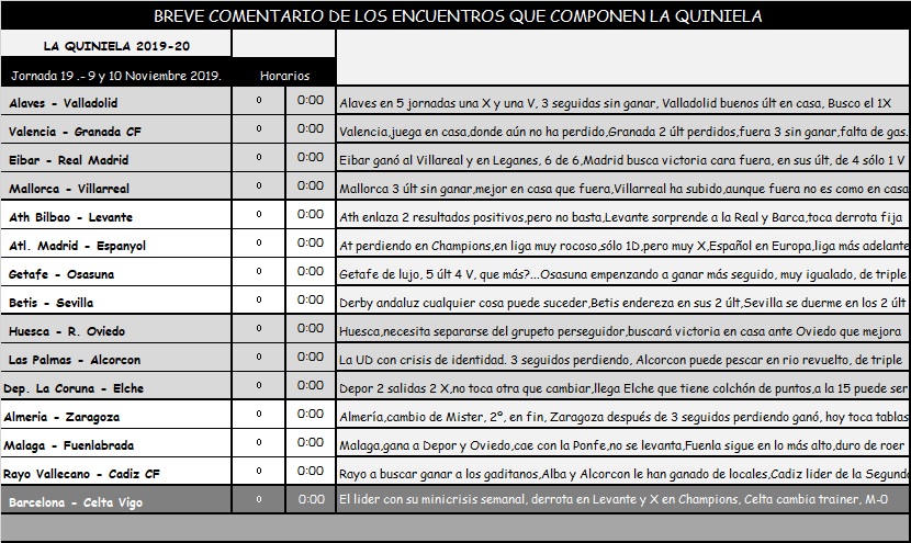 QUINIELA 19 TEMPORADA 19-20; SABADO Y DOMINGO 9 Y 10 NOV. 2019. MIS CONTENIDOS