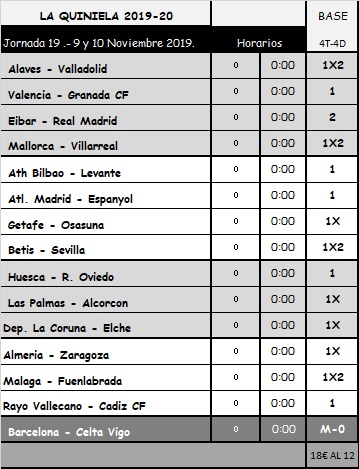 QUINIELA 19 TEMPORADA 19-20; SABADO Y DOMINGO 9 Y 10 NOV. 2019.