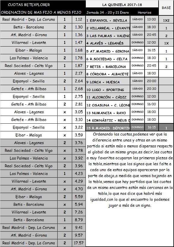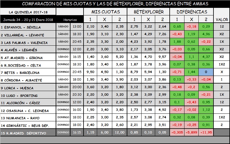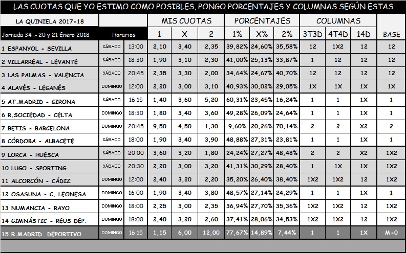 RESULTADO DE MIS COLUMNAS EN LA QUINIELA 34, SÁBADO Y DOMINGO 20 Y 21 DE ENERO 2018.