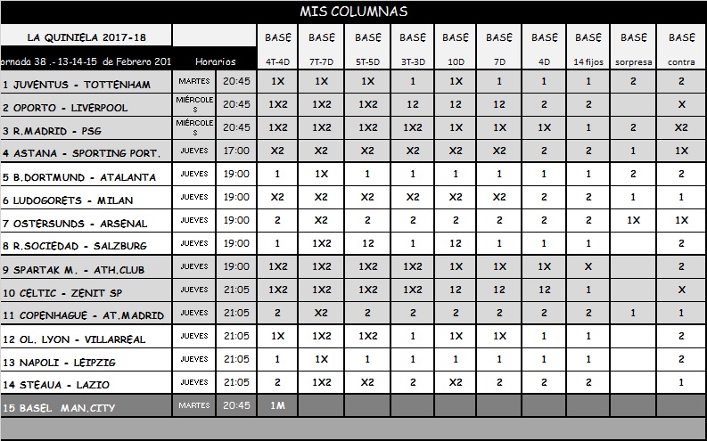 QUINIELA 38, MARTES, MIERCOLES Y JUEVES 13-14 Y 15 DE FEBRERO 2018.