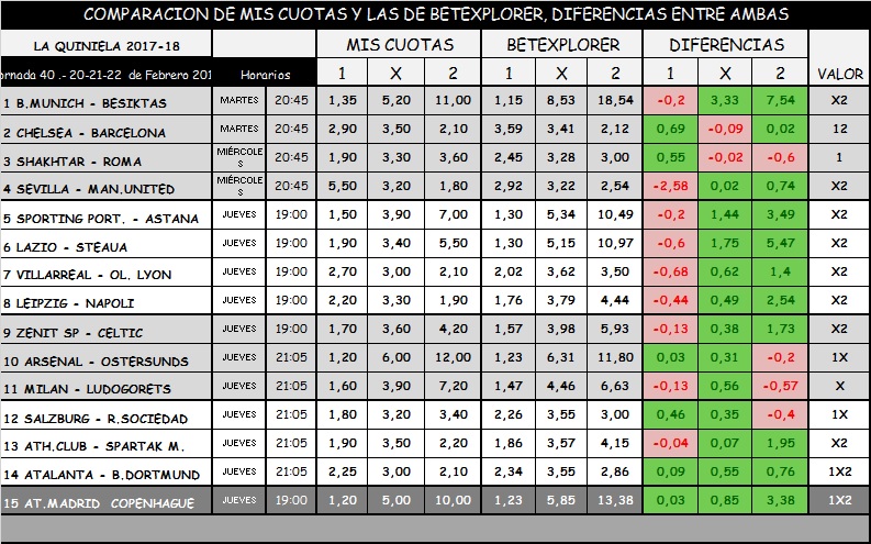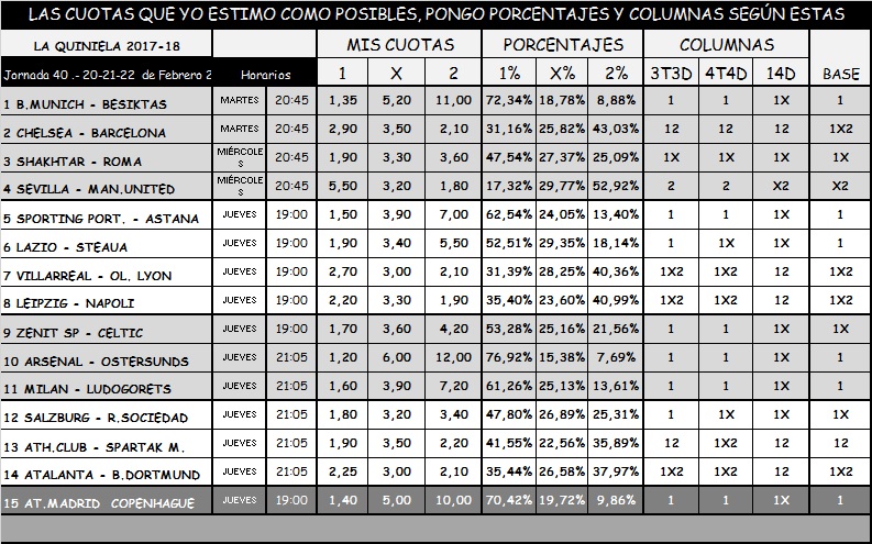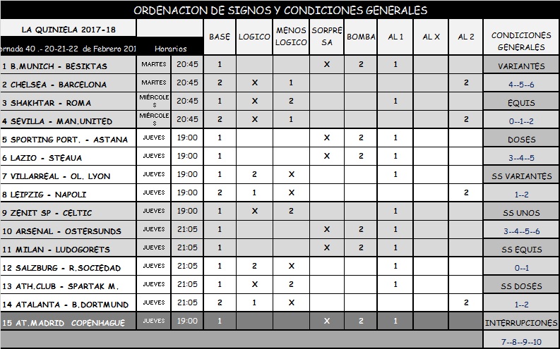 QUINIELA 40, MARTES, MIERCOLES Y  JUEVES 20-21 Y 22 DE  FEBRERO 2018.