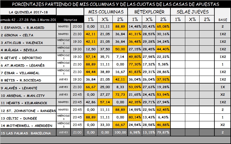 QUINIELA 42, MARTES, MIERCOLES Y JUEVES 27-28 FEBRERO Y 1 DE MARZO 2018.