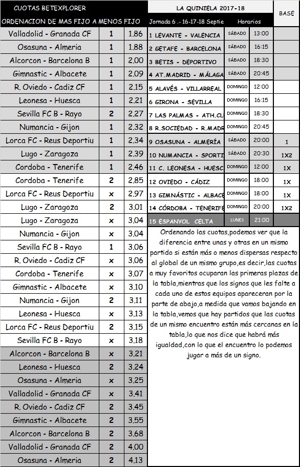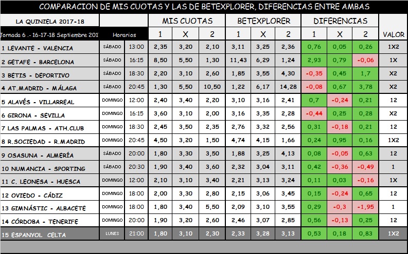 QUINIELA 6, SÁBADO, DOMINGO Y LUNES, 16-17-18 SEPTIEMBRE 2017.