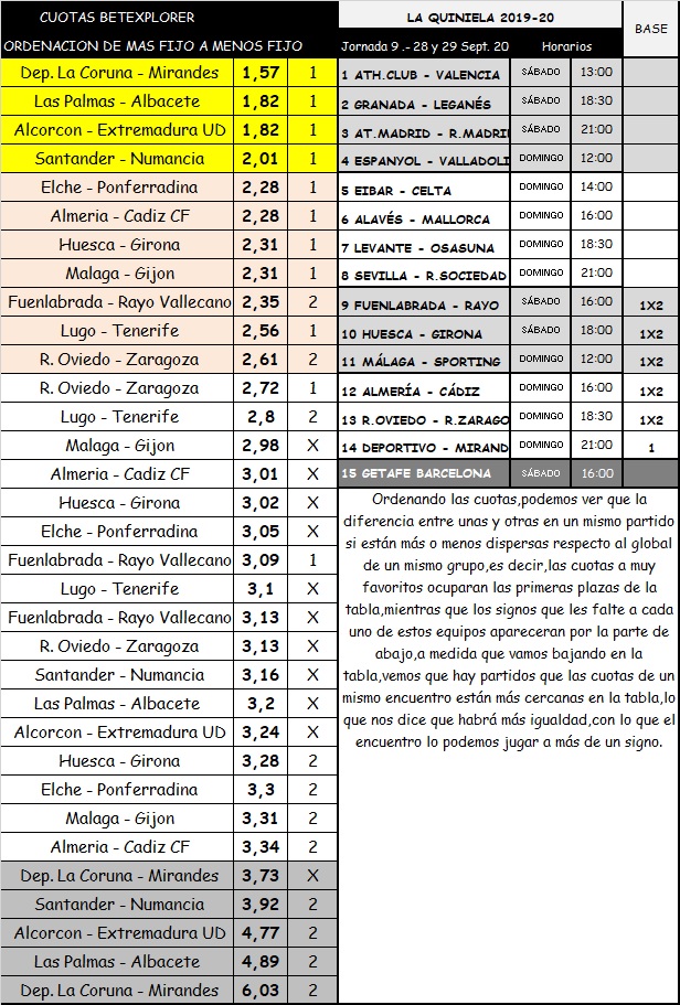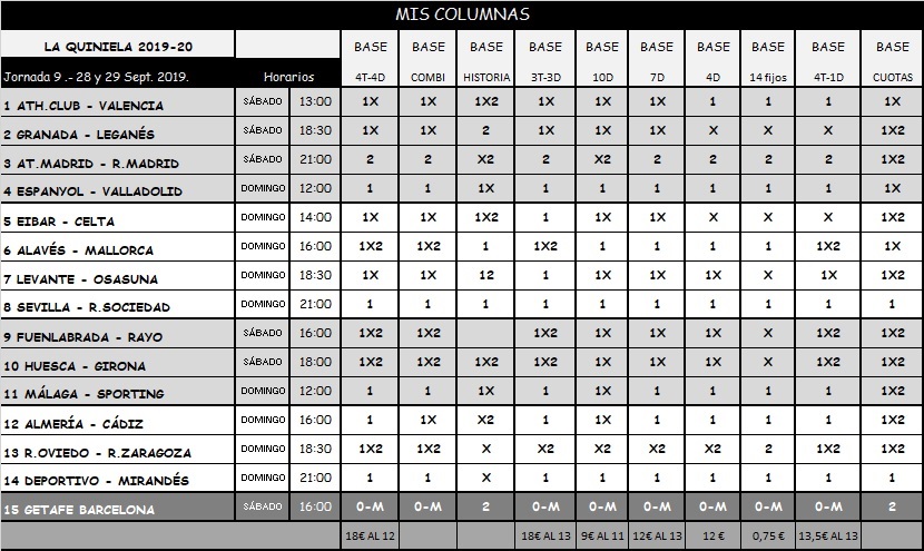 QUINIELA 9 TEMPORADA 19-20; SABADO Y DOMINGO 28 Y 29 SEPT. 2019.